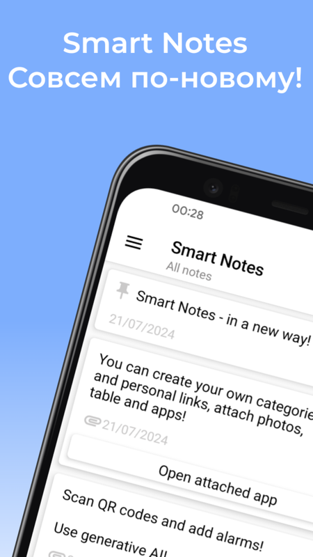 В Smart Notes вы можете использовать технологии генеративного ИИ, создавать заметки со своими собственными категориями и персонализированными ссылками, форматировать текст, делать его курсивным, жирным, подчеркнутым или зачеркнутым, прикреплять фотографии, приложения и таблицы. Вы можете сканировать QR-коды, не выходя из приложения. У вас также есть доступ к уникальным настройкам, сделанным для максимального удобства использования приложения. И все это в одном приложении!