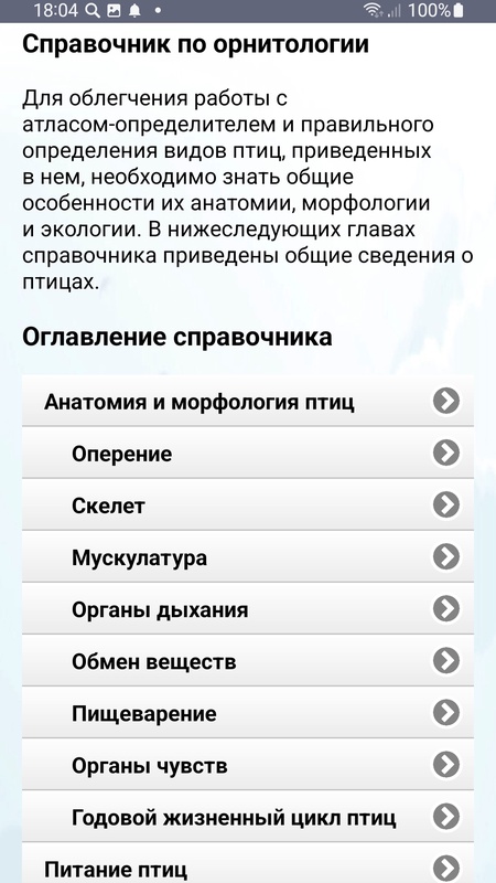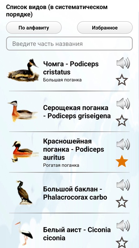 Описаны наиболее распространенные виды птиц средней полосы России – водоплавающие, хищные, куриные, кулики, чайки, совы, дятлы, воробьиные - жаворонки, трясогузки, врановые, дрозды, пеночки, мухоловки, вьюрковые и все остальные… Список видов птиц, включенных в приложение, можно посмотреть тут: http://ecosystema.ru/04materials/guides/mob/and/14birds.htm