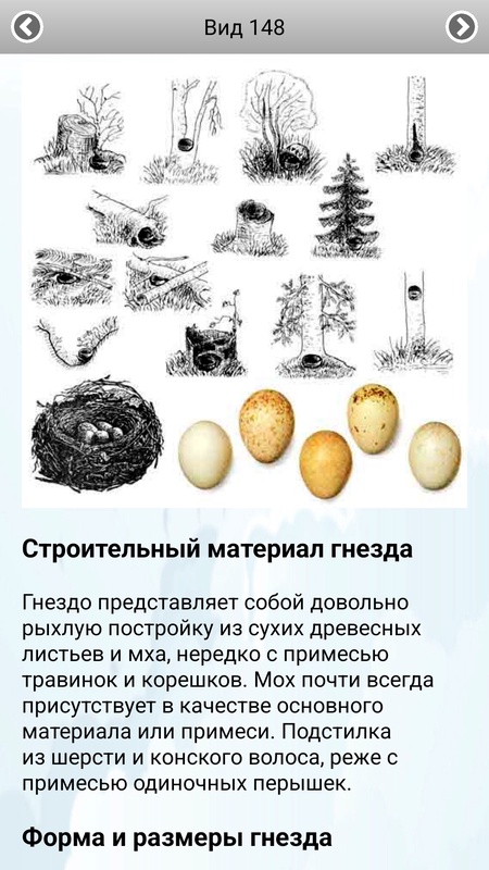 В атласе-энциклопедии можно посмотреть изображения определенного вида птицы – фотографию и рисунки самца и самки (если они различаются), рисунки гнезд и яиц, а также прочитать информацию о данном виде птицы, включая ее внешний вид, голос, местообитания, места гнездования, строительный материал, местоположение, форма и размеры гнезда, особенности кладки, сроки гнездования, распространение, зимовки…