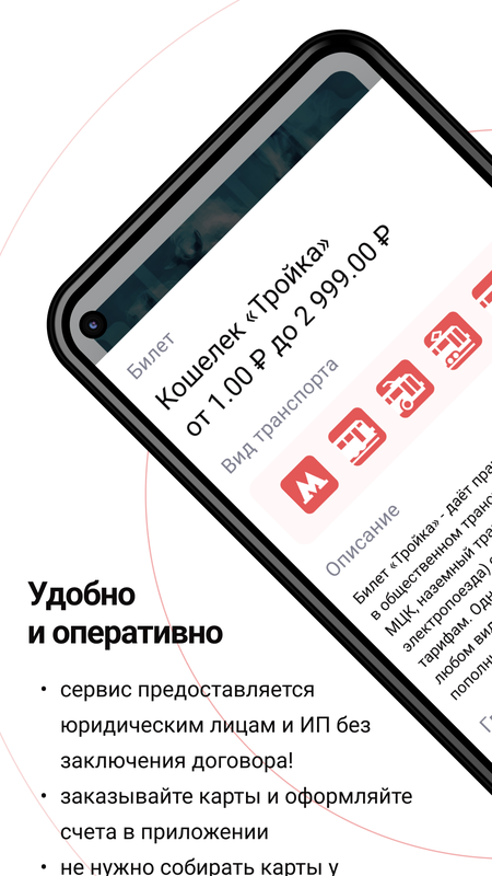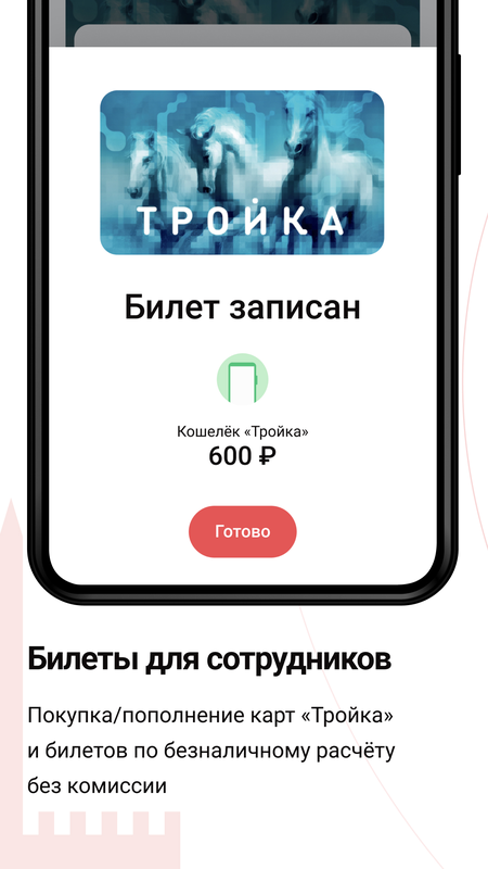 Функции приложения позволяют вам просматривать записанные на карту проездные билеты, приобретать проездные билеты, а также записывать их на карту «Тройка», брелок или браслет после оплаты.