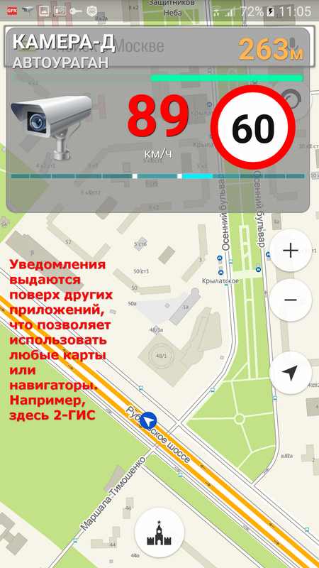 Приложение-антирадар предназначено для предупреждений о стационарных камерах видеофиксации нарушений ПДД (Автоураган, Кордон, Стрелка, Автодория, Арена, Вокорд, Крис и многие другие), постах ГИБДД, опасностях на дороге (населенные пункты, переезды, переходы, неровности и т.п.) и мобильных засадах
