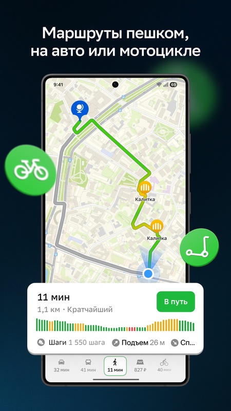 Навигатор для пешехода, велосипеда и самоката с точным GPS и ГЛОНАСС. 2ГИС умеет строить маршруты по городу с учётом уклона и набора высоты, велодорожек и лестниц.