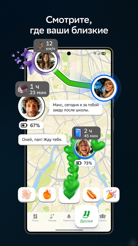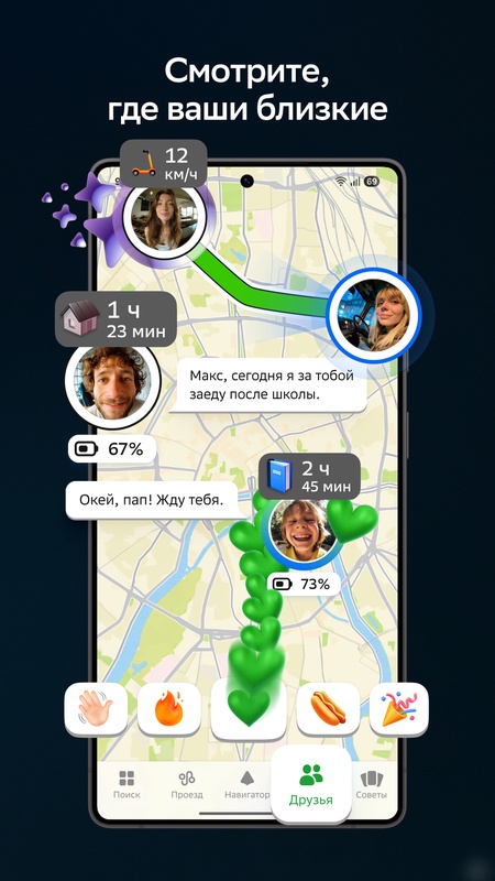 Геолокация друзьей на карте. Добавляйте близких «в друзья» — чтобы видеть друг друга на карте городе в реальном времени на карте! Можно не спрашивать «где ты?», — а просто посмотреть местоположение друзей на карте.