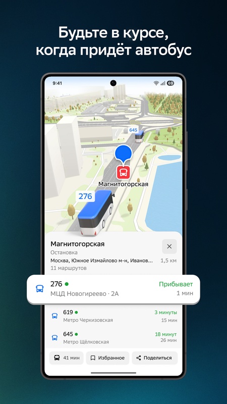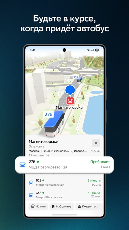 Общественный транспорт. Навигатор построит маршруты на метро, автобусе, маршрутке, троллейбусе, трамвае и электричке. Выбирайте кратчайшие или самые удобные. Включите отслеживание автобусов на карте в реальном времени. Ориентируйтесь на расписание, — включая расписание электричек, — и смотрите на реалистичный прогноз прибытия автобуса к остановке. Точные схемы метро Москвы, Санк-Петербурга и других городов.
