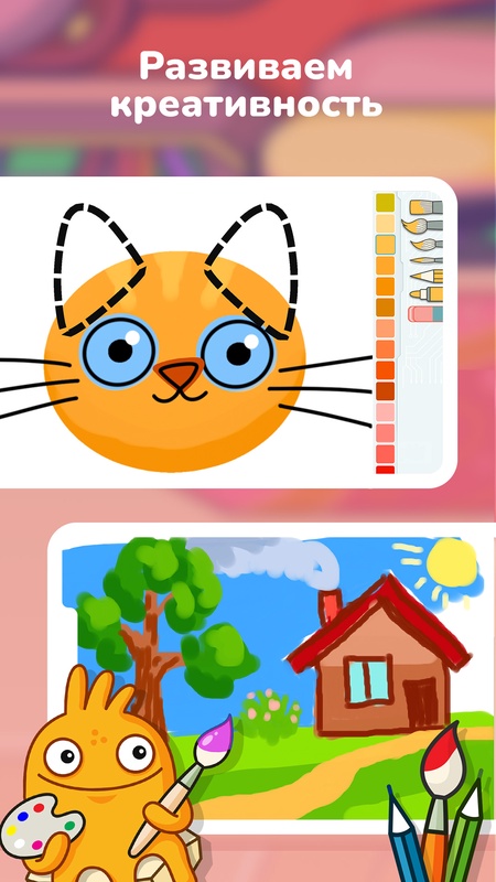 В приложении есть веселая рисовалка для детей — сборник игр на развитие творческих способностей. Они научат ребенка рисовать предметы и животных в свободном режиме, строить композицию, передавать форму и пропорции на рисунке.