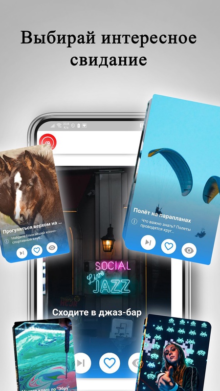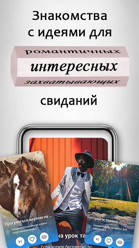 Лайкай идеи для свиданий и жди приглашения. Без регистрации! Просто установи приложение и можешь начинать знакомиться.