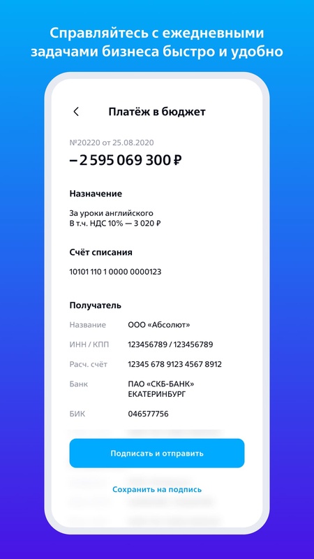 В мобильном банке доступны все базовые daily-banking операции для ведения бизнеса: все виды платежей, шаблоны платежей, выписки и заказ справок.