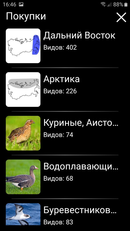 Основные функции приложения бесплатны - для каждого вида птицы можно просматривать ее изображение и текстовое описание и добавлять виды в Избранное (эти функции доступны оффлайн), а также проигрывать запись ее голоса (при наличии соединения с Интернетом и не чаще 1 раза в минуту). Платные функции дают возможность неограниченного пользования Определителем и Викториной, открывают доступ к дополнительным цветным изображениям, а также дают возможность проигрывать все записи голосов птиц оффлайн. Можно приобрести доступ как ко всем видам птиц (группа «Все виды»), так и к любой географической или систематической группе птиц.