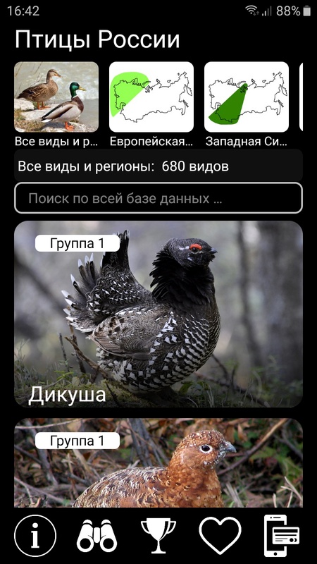 Для каждого вида приведены несколько фотографий птицы в природе (самец, самка/молодые, птица в полёте), карта ареала, а также текстовое описание внешнего вида, поведения, особенностей размножения и питания, распространения и миграций. Часто используемые виды птиц можно добавлять в Избранное.