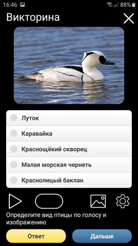 В приложение встроена Викторина, с помощью которой можно тренироваться распознавать птиц по голосам и внешнему виду. Играть в викторину можно многократно – вопросы на узнавание видов чередуются в случайном порядке и ни разу не повторяются! Сложность Викторины можно настраивать – изменять число вопросов, изменять число ответов для выбора, включать и выключать изображения птиц.