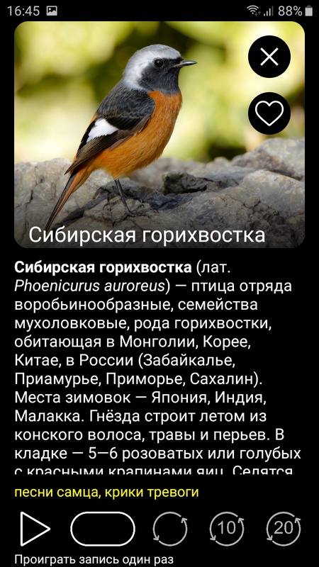 ПРИЛОЖЕНИЕ СОДЕРЖИТ записи голосов 680 видов птиц, распространенных на территории Северной Евразии - от Восточной Европы до Дальнего Востока и от Северного Ледовитого океана до Кавказа, Средней Азии и Китая. Список видов птиц, включенных в приложение, можно посмотреть на нашем сайте: http://ecosystema.ru/04materials/guides/mob/and/18golosa_ru.htm