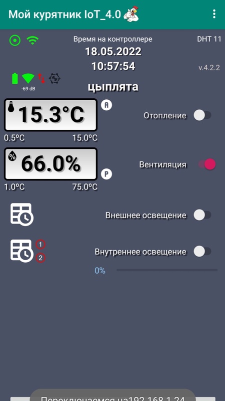 Приложение позволяет осуществлять настройку и управление контроллером Мой курятник IoT 4.0.