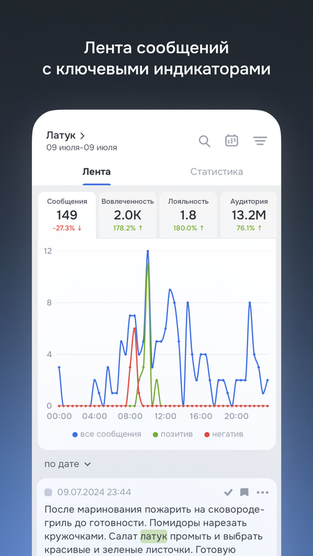 - Проводить экспресс-оценку метрик динамики упоминаний, тональности и тематики публикаций;