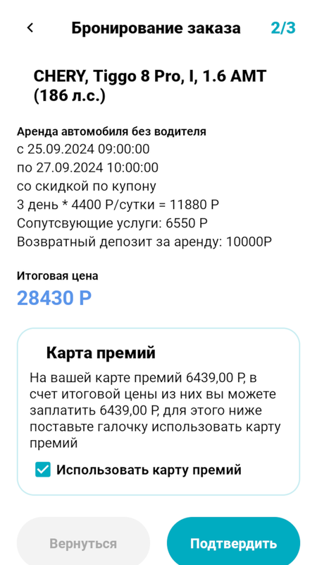 Приложение предоставляет возможность заполнить личный кабинет при регистрации, указав данные о себе один раз и изменять их по мере необходимости, а пользователи у которых зарегистрирована карта премий, могут использовать ее, оплачивая бонусами часть итоговой цены за аренду выбранного автомобиля. Но если карты премий у вас нет, приложение предоставит вам возможность ее завести.