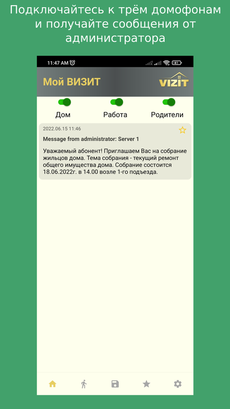 - дублирование звонка с домофона VIZIT на смартфон / планшет абонента