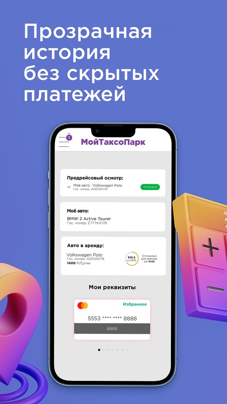 Универсальный инструмент для взаимодействия водителя с парком и агрегатором для работы в такси или доставке. Простой и удобный интерфейс как для новичков, так и для водителей со стажем. Подходит для работы водителем в такси и доставке как на своем автомобиле, так и на автомобиле парка. Приложение поможет подобрать автомобиль в аренду или аренду с выкупом.