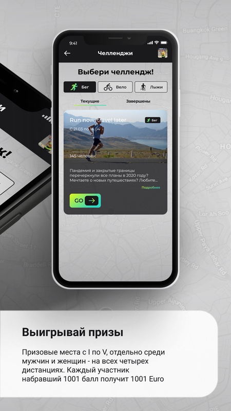 Бег, велосипед, ходьба с фантастическими призами по итогам челленджа. Чем больше и успешнее участвовать в мероприятиях на платформе, тем больше баллов можно набрать и больше призов выиграть, а при достижении отметки в 1001 балл – КАЖДЫЙ участник получит денежный приз – 1001 EURO.