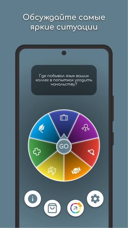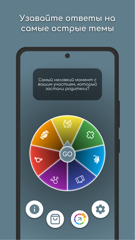 Правила очень простые! Вам нужно нажать кнопку «GO» и ждать, когда фортуна определит вам тему. По теме, которая вам выпадет, будет высвечиваться случайный вопрос, на который нужно ответить.