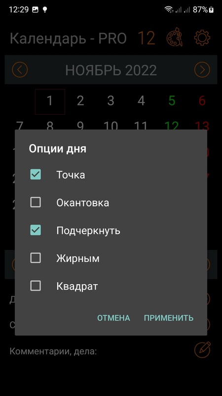 - После установки, данные группы отображаются методом подчеркивания соответствующих дат на виджете и в основной форме.