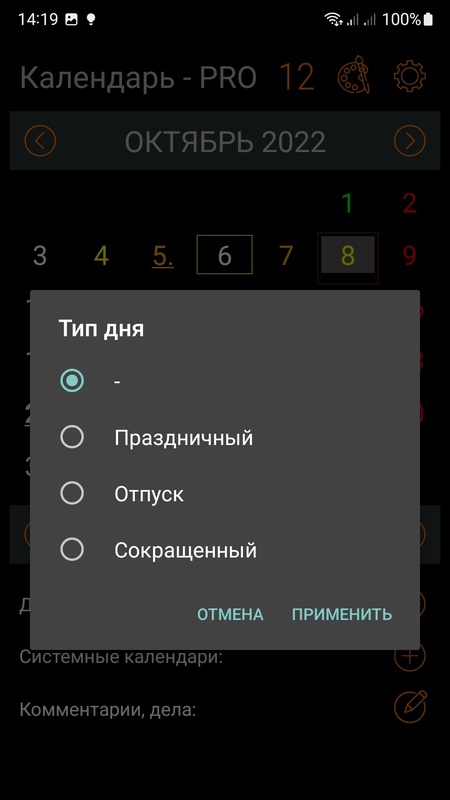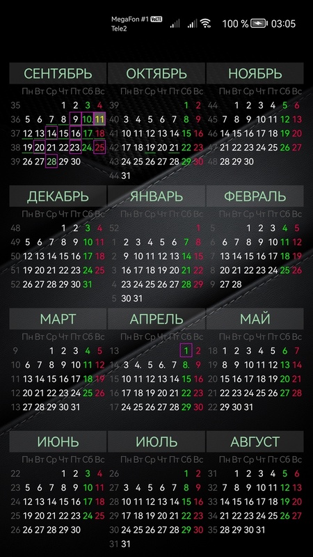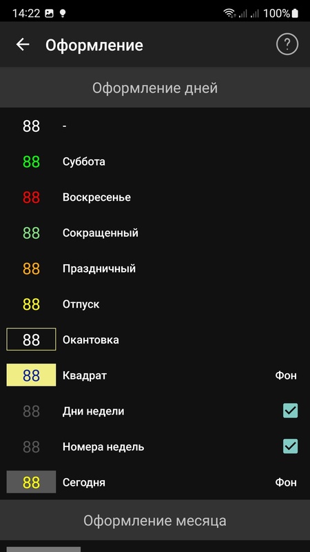 -- Возможность отметить любой день как рабочий, сокращенный, выходной или отпуск с подсветкой разными цветами