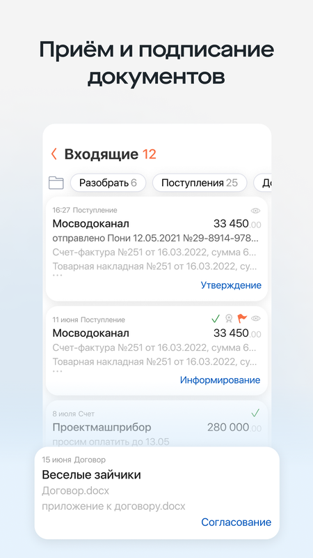 • Принимайте и подписывайте документы