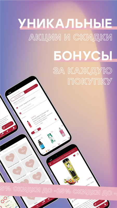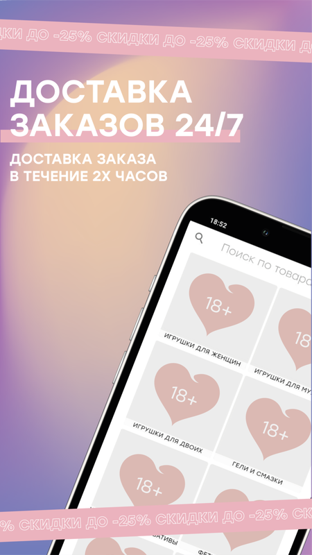 Заказ товаров для взрослых через мобильное приложение в любое время. Возможна доставка по Москве, МО, Санкт-Петербургу, Екатеринбургу, Сочи и Красноярску в течение 2-х часов, а также самовывоз из любого магазина сети.