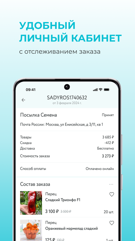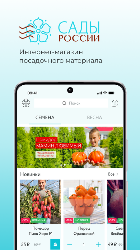 С нашим новым приложением вы можете увидеть весь огромный ассортимент «Садов России», сделать покупки семян и саженцев и следить за новинками садово-огородной моды.