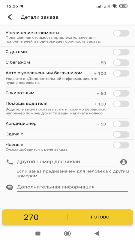 В пожеланиях к заказу укажите информацию о багаже, животном, дополнительной услуге, крупной купюре, наличии кондиционера, доплате к стоимости, комментарии или другом номере телефона при заказе такси для другому человеку!