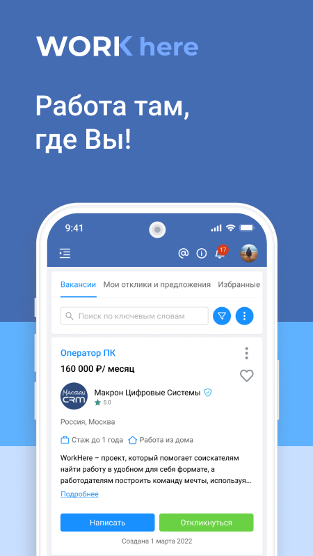 WorkHere - профессиональный инструмент для быстрого поиска сотрудников в Вашу команду. В приложении Вы найдёте обширную базу квалифицированных кандидатов из различных направлений: продажи, IT, маркетинг/реклама, административный персонал, финансы, бухгалтерия и многие другие. Новые кандидаты регистрируются ежедневно!