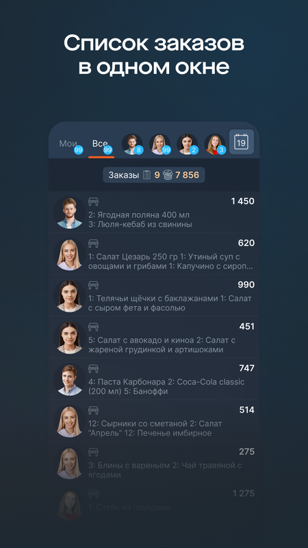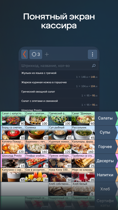 Добавляйте блюда в чек за пару секунд, оформляйте продажи и принимайте оплату наличными и по карте. По итогам смены Presto оформит акт выпуска и спишет использованные продукты с нужного склада.