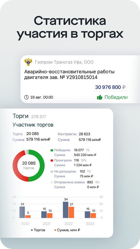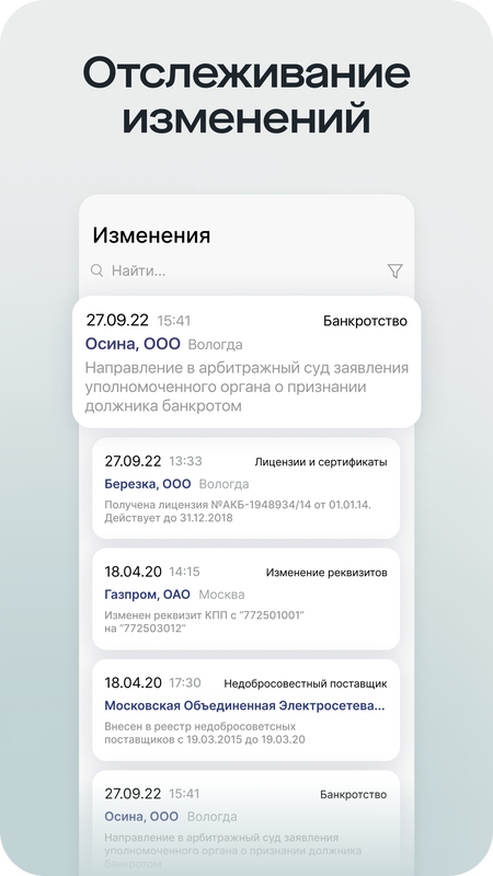 Прямо со смартфона узнавайте обо всех новых событиях и рисках по избранным контрагентам. Saby защитит ваш бизнес от недобросовестных партнёров: предупредит о неожиданном банкротстве, блокировке счетов, смене директора, новом суде и других изменениях, важных для принятия решения о дальнейшем сотрудничестве.